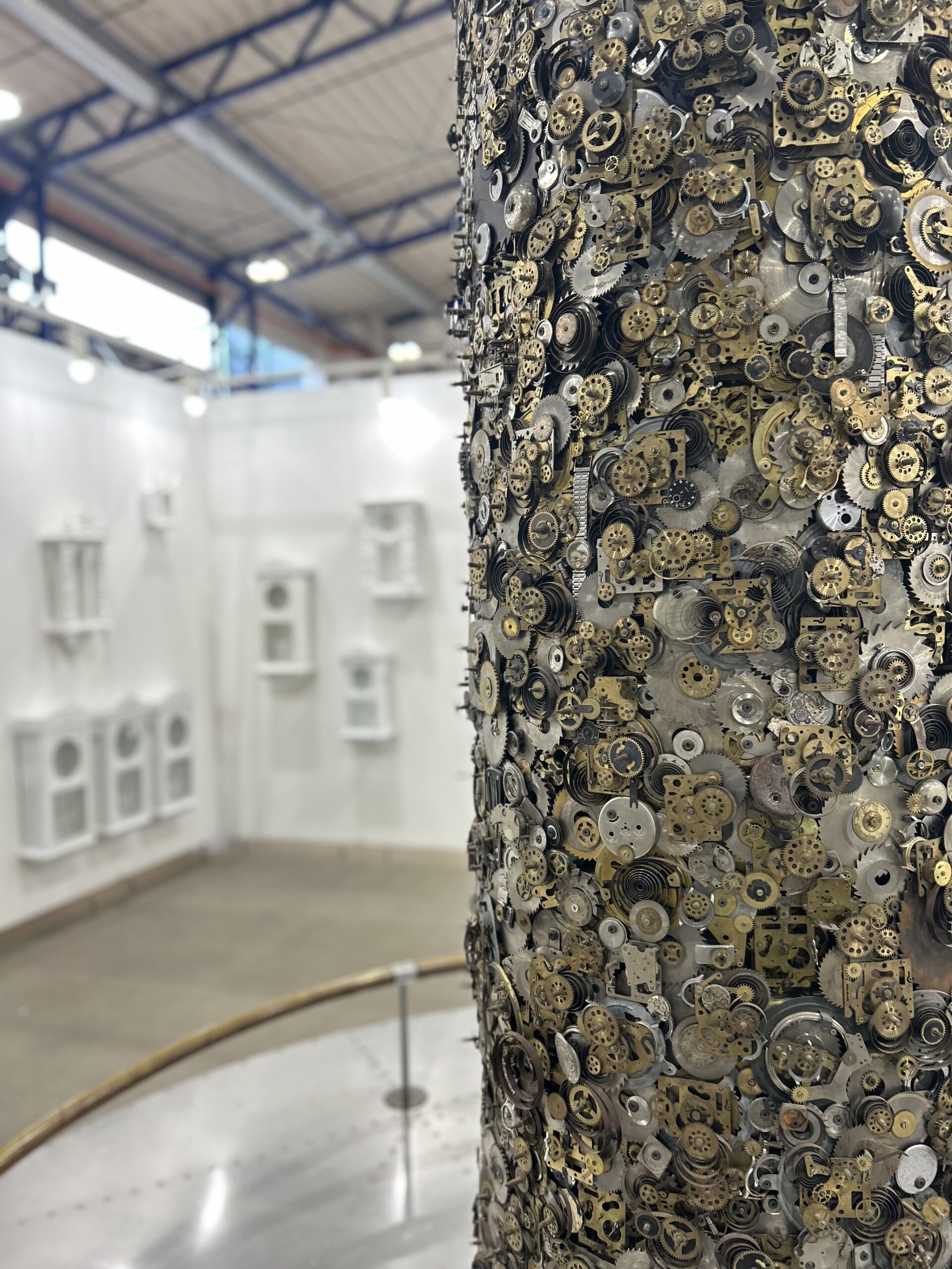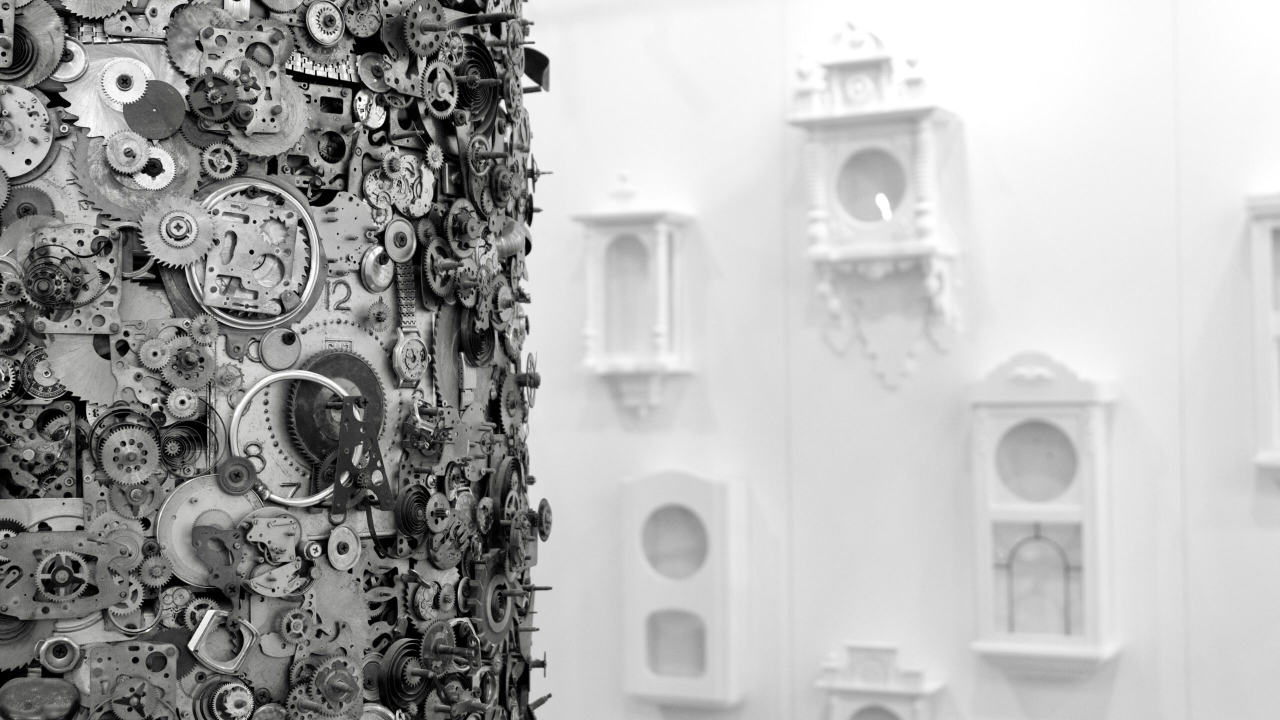 Skulptūra „Chronos“ Plastikas, mechaninių laikrodžių dalys ir mechanizmai, diskiniai pjūklai h-430 cm.
